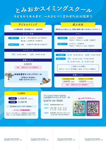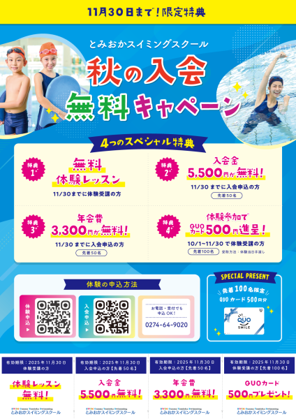 とみおかスイミングスクールでは、11月30日(日)まで「秋の入会無料キャンペーン」を実施しております。